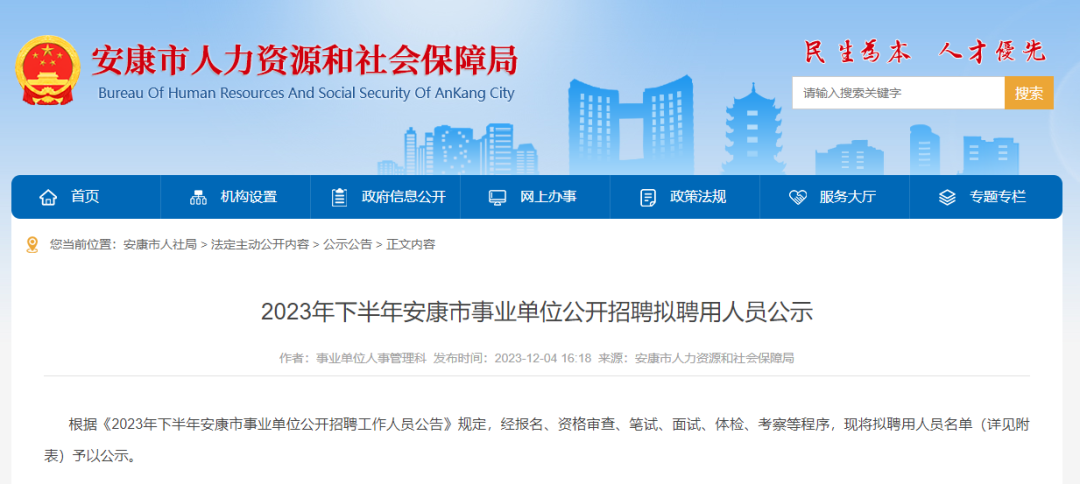 12月4日,安康市人力資源和社會保障局發(fā)布2023年下半年安康市事業(yè)單位公開招聘擬聘用人員公示。