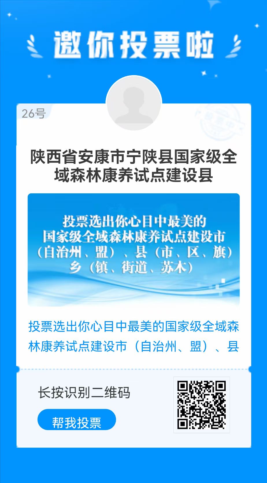 據(jù)了解,國(guó)家級(jí)森林康養(yǎng)試點(diǎn)建設(shè)單位認(rèn)定工作由中國(guó)林業(yè)產(chǎn)業(yè)聯(lián)合會(huì)負(fù)責(zé)開(kāi)展,經(jīng)自愿申報(bào)、主管部門(mén)審核推薦、合規(guī)用地和安全經(jīng)營(yíng)專(zhuān)項(xiàng)檢查、當(dāng)?shù)毓、?zhuān)家審查及認(rèn)定結(jié)果全國(guó)公示等程序,確定了2023年國(guó)家級(jí)森林康養(yǎng)試點(diǎn)建設(shè)單位名單。同時(shí)還開(kāi)設(shè)投票活動(dòng),選出大眾心目中最美的國(guó)家級(jí)森林康養(yǎng)試點(diǎn)建設(shè)基地和中國(guó)森林康養(yǎng)人家,請(qǐng)為森林履蓋率全國(guó)第一的“秦嶺之心 綠都寧陜”投上您寶貴的3票。ㄩL(zhǎng)按二維碼即可投票,每個(gè)微信號(hào)每天可投3票)