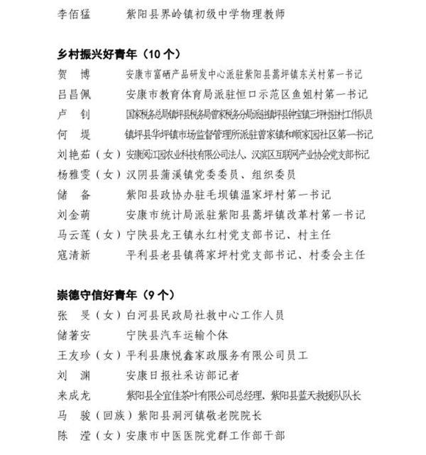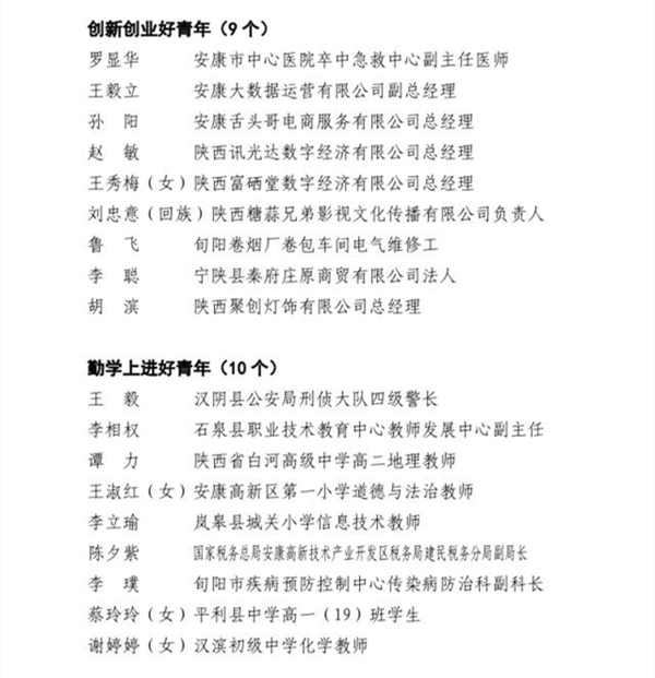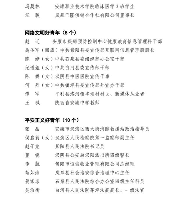 近日,由市委組織部、市委宣傳部、市委文明辦、市委政法委、市委網(wǎng)信辦、市教體局、市科技局、市民政局、市人社局、市鄉(xiāng)村振興局、市衛(wèi)健委、團(tuán)市委、市青聯(lián)共同開展的第四屆“‘中國(guó)夢(mèng)·青年志’——尋找身邊的安康好青年”主題活動(dòng)結(jié)果揭曉。