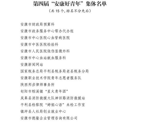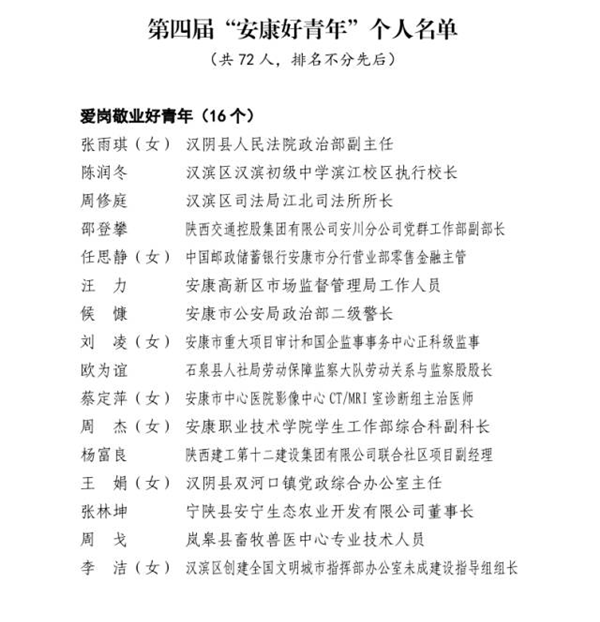經(jīng)推報(bào)、初選、評(píng)審、復(fù)核、公示等環(huán)節(jié)現(xiàn)推選張雨琪等72人為第四屆“安康好青年”個(gè)人,安康市財(cái)政局預(yù)算科等15個(gè)集體為第四屆“安康好青年”集體。