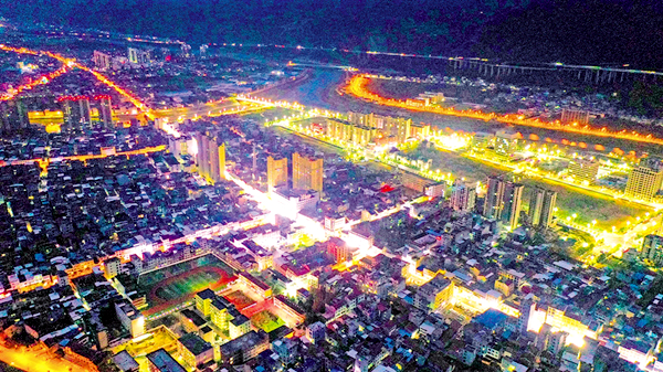 恒口示范區(qū)夜幕下流光溢彩的城市道路交通網(wǎng)絡(luò)。