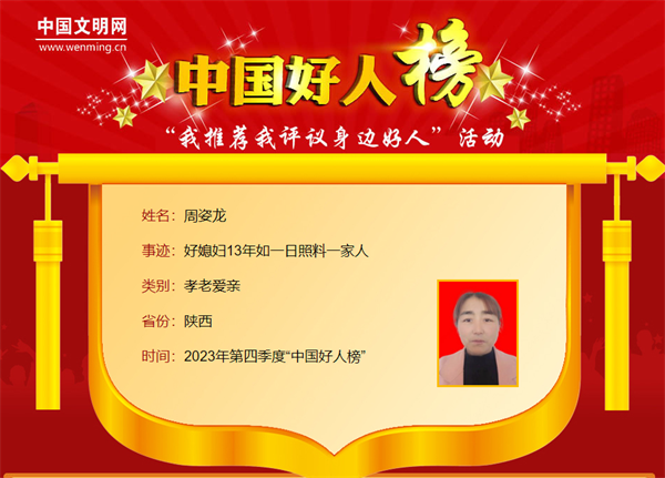 周姿龍,女,1969年8月生,陜西省安康市漢濱區(qū)晏壩鎮(zhèn)泰山廟村村民。丈夫車禍摔跤致癱在家后,周姿龍堅強地挑起了生活的重擔。13年來,她護理身體癱瘓的丈夫、照顧精神障礙的姑姐、照料年事已高的公公,用自己的堅定和責任,為家人撐起了一片愛的天空。