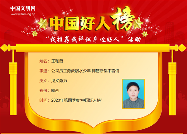 王和勇,男,1987年8月生,陜西省水務(wù)公司職工。在少年溺水的危機時刻,王和勇忘記自己“準爸爸”的身份,毫不猶豫跳進水流湍急的河里奮勇施救。王和勇曾獲“陜西好人”榮譽。