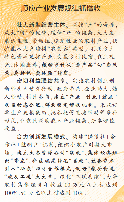 把握市場(chǎng)運(yùn)行規(guī)律抓改革。用活土地要素。統(tǒng)籌農(nóng)村“三塊地”改革,扎實(shí)推進(jìn)承包地延期,在農(nóng)民自愿前提下實(shí)施農(nóng)田集中連片整理。加強(qiáng)農(nóng)村宅基地管理,嚴(yán)格落實(shí)“一戶一宅”政策。探索集體經(jīng)營(yíng)性建設(shè)用地“同等入市、同權(quán)同價(jià)”,兼顧國(guó)家、農(nóng)村集體經(jīng)濟(jì)組織和農(nóng)民利益。配置流動(dòng)要素。順應(yīng)人口流動(dòng)和產(chǎn)業(yè)發(fā)展趨勢(shì),提高城鄉(xiāng)要素雙向協(xié)同效率,推動(dòng)要素市場(chǎng)化改革。促進(jìn)有能力在城鎮(zhèn)穩(wěn)定就業(yè)和生活的農(nóng)業(yè)轉(zhuǎn)移人口有序市民化,落實(shí)常住地提供基本服務(wù)制度。集成治理要素。深化“五治融合”創(chuàng)新舉措,實(shí)施農(nóng)村基層治理提升工程。