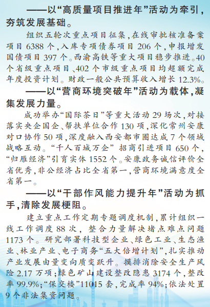 社會(huì)治理堅(jiān)實(shí)穩(wěn)固。安全監(jiān)管有力。未發(fā)生重大及以上生產(chǎn)安全事故。組建819支應(yīng)急救援隊(duì)伍,落實(shí)2966處地質(zhì)災(zāi)害隱患監(jiān)測(cè)預(yù)警,成功應(yīng)對(duì)17輪次強(qiáng)降雨。社會(huì)穩(wěn)定有序。信訪法治化試點(diǎn)全省先行,信訪工作綜合考核名列全省第一。創(chuàng)新舉措有效。村財(cái)審計(jì)監(jiān)督在全國(guó)成為經(jīng)驗(yàn)。社會(huì)治理“安康模式”全省推廣,平安建設(shè)滿意度全省第一,獲評(píng)“全國(guó)市域社會(huì)治理現(xiàn)代化試點(diǎn)合格城市”。