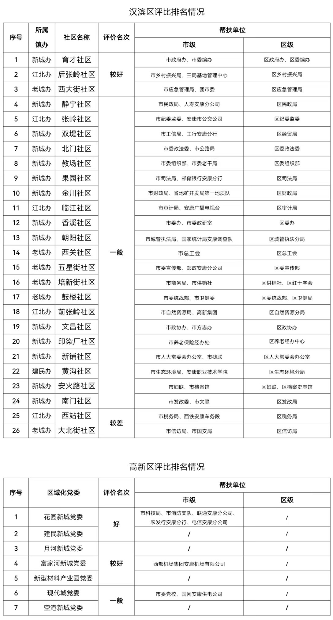 按照市創(chuàng)文辦《關(guān)于扎實(shí)開展全域評(píng)比排名工作的通知》(安創(chuàng)文辦發(fā)〔2023〕2號(hào))要求,近期,漢濱區(qū)、高新區(qū)組織對(duì)各鎮(zhèn)辦、區(qū)域化黨委、社區(qū)(村)、托管村創(chuàng)文階段性工作成效進(jìn)行了評(píng)比排名,現(xiàn)將結(jié)果通報(bào)如下: