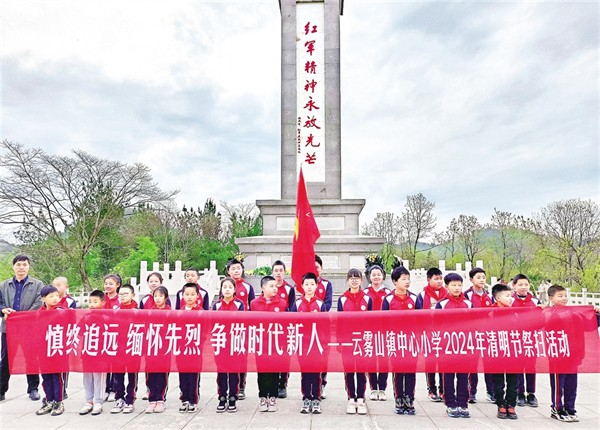 ▲ 4月1日,在清明節(jié)即將到來之際,石泉縣云霧山鎮(zhèn)中心小學(xué)組織部分少先隊員,在紅軍英雄紀(jì)念碑前開展愛國主義教育。譚相華 攝