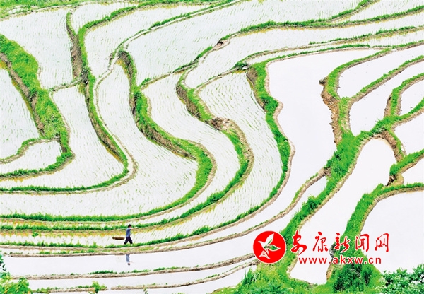 來鳳堰梯田最好的時候,就是等到灌水插秧的時候。規(guī)模宏大的梯田,如同蘸了水的綢帶,飄逸靈動、若隱若現(xiàn),一縷縷的陽光灑在梯田之上,讓插秧的水都泛著金光。