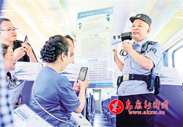 “我已經(jīng)發(fā)展了三個(gè)志愿者!”老范一邊興高采烈地說著,一邊從他的工作包中找出志愿者袖標(biāo)及徽章。就在剛才,在站臺(tái)上引導(dǎo)旅客上車的老范憑著自己的親和力,很快就物色了幾名自愿擔(dān)任平安列車志愿者的旅客。老范隨后給志愿者佩戴袖標(biāo)及徽章,給他們開展崗前培訓(xùn),帶他們?cè)诹熊嚿祥_展反詐和防盜等安全宣傳。
