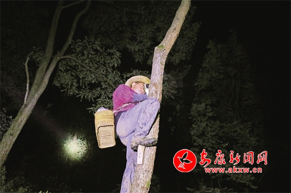 從19歲開始,羅宗兵就和這片漆林打交道,哪兒有幾棵樹,哪棵樹上有幾個口子,他都一清二楚。只見羅宗兵頭戴礦燈,熟練地爬到一棵漆樹上,用割漆刀在原來開過口的“牛鼻子”位置輕輕一割,乳白色的液體冒出,隨之緩緩流入到用稠樹葉制作的器皿中。因?yàn)樯嵊懈g性,所以割漆人盛漆選擇的都是楠樹葉或稠樹葉。上樹、下樹、轉(zhuǎn)彎、過河、爬坡……在伸手不見五指的漆林里,羅宗兵穿梭自如。