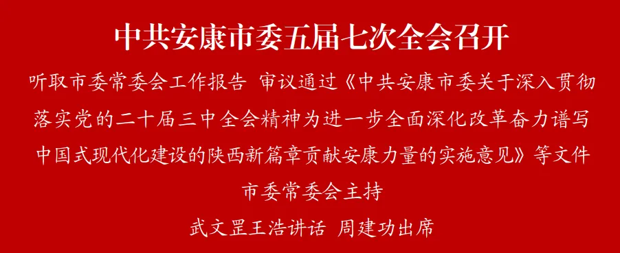 全會(huì)由市委常委會(huì)主持。市委書(shū)記武文罡講話并就《中共安康市委關(guān)于深入貫徹落實(shí)黨的二十屆三中全會(huì)精神為進(jìn)一步全面深化改革奮力譜寫(xiě)中國(guó)式現(xiàn)代化建設(shè)的陜西新篇章貢獻(xiàn)安康力量的實(shí)施意見(jiàn)》作說(shuō)明。市委副書(shū)記、市長(zhǎng)王浩部署經(jīng)濟(jì)工作。市政協(xié)主席周建功出席會(huì)議。市委常委、統(tǒng)戰(zhàn)部部長(zhǎng)、政法委書(shū)記寇全安就《中共安康市委關(guān)于在中國(guó)式現(xiàn)代化道路上建設(shè)平安祥和幸福安康的實(shí)施意見(jiàn)》作說(shuō)明,市委常委、市紀(jì)委書(shū)記、市監(jiān)委主任羅曉君就《中共安康市委關(guān)于在中國(guó)式現(xiàn)代化道路上建設(shè)風(fēng)清氣正幸福安康的實(shí)施意見(jiàn)》作說(shuō)明。