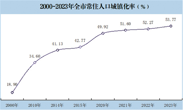 城鎮(zhèn)化步伐明顯加快。1949年,安康總?cè)丝?46.75萬人,其中農(nóng)業(yè)人口占89.4%,屬于典型傳統(tǒng)的農(nóng)村社會,交通不便,人員相對封閉不流動。改革開放后,市場經(jīng)濟體制逐步建立,特別是2000年撤地設(shè)市,對安康具有劃時代和里程碑的意義。2021年旬陽撤縣設(shè)市,成為陜南首個縣級市,標志著全市城鎮(zhèn)化步伐邁向更高水平。全市抓住東部勞動密集型產(chǎn)業(yè)向中西部轉(zhuǎn)移的機遇,依托易地搬遷集中安置點,大力興辦新社區(qū)工廠,把農(nóng)民變?yōu)榫用,大力開展新環(huán)境、新服務(wù)、新產(chǎn)業(yè)、新民風、新生活“五新”社區(qū)創(chuàng)建工作,完善配套設(shè)施,健全服務(wù)體系,城鎮(zhèn)化建設(shè)步伐顯著加快。2023年,全市戶籍人口300.75萬人,常住人口245.72萬人。常住人口城鎮(zhèn)化率由2000年的18.9%,提高到2023年的53.77%,23年間提高了34.87個百分點。