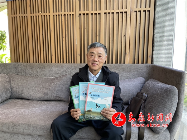 在瀛湖翠屏島上,采訪團(tuán)采訪了退休教師林俊禮。林俊禮今年70歲。他從2015年開始用相機(jī)記錄調(diào)查漢江陜西段動(dòng)植物,依據(jù)一手資料編寫了國家南水中線水源地生態(tài)科普三部曲《神奇的水鳥》《可愛的魚類》《多彩的水生植物》,來宣傳漢江陜西段美好生態(tài)資源。