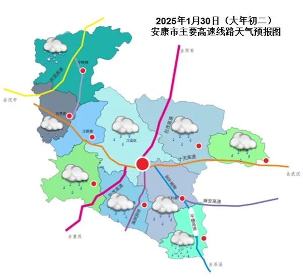 今天白天到明天白天我市有明顯的雨雪降溫天氣,春節(jié)期間,初二到初四(1月30日至2月1日)有弱的雨雪降溫天氣,恰逢春運春節(jié)返鄉(xiāng)、旅行等出行高峰時段,包茂高速、麻安高速、十天高速、G541等高速及秦嶺和巴山高山的部分路段需注意道路濕滑、結冰,低能見度對交通安全的不利影響,防范雨雪天氣造成的道路擁堵和交通事故;公眾行車注意小心慢行。其余時段我市天氣較利于出行。