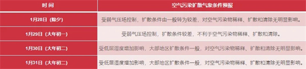 1月24日至27日,受雨雪降溫天氣影響,擴散條件較好。1月28日至29日,地面氣壓場轉弱,擴散條件轉差,我市大部空氣質量以良至輕度污染為主,煙花爆竹集中燃放時段可能出現(xiàn)短時重度或以上污染,首要污染物為PM2.5。1月30日至31日,受低層濕度增加影響,擴散條件一般。2月1日至4日,受冷空氣清除作用影響,擴散條件較好。