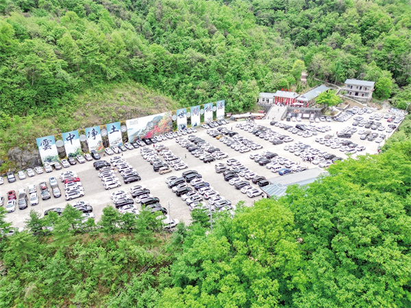 “五一”假期,嵐皋縣南宮山景區(qū)持續(xù)火爆。圖為“滿員”的北線停車場。 陳陽 攝