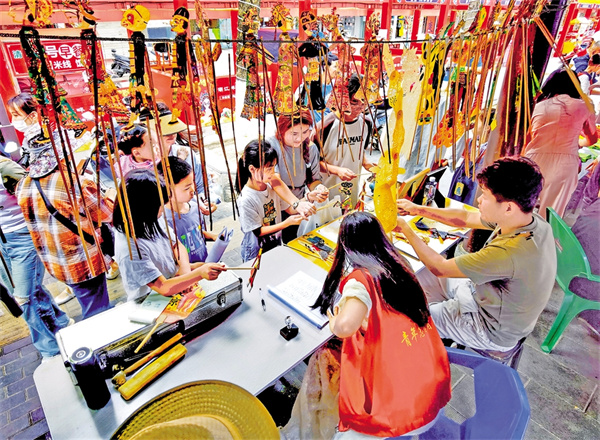 “五一”假期,安康非遺文化展示活動在漢濱區(qū)老城街道民俗夜市長廊舉辦,安康皮影吸引游人駐足欣賞。吳定國 攝