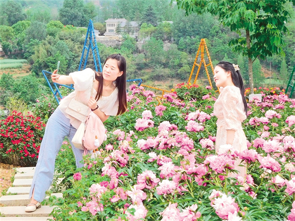 “五一”假期,漢陰縣花遇灣牡丹園迎來旅游高峰。圖為游人在花叢中打卡拍照,盡享游園樂趣。 趙波 攝