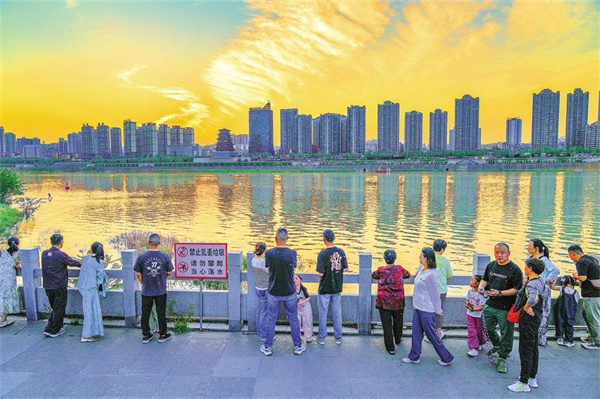 5月2日,天邊的云彩被夕陽染成了暖黃色,與江水的波光相互輝映,構(gòu)成了一幅絕美的畫卷。圖為安康城區(qū)濱江公園的步道上,眾多游客在享受愜意的時光。皮勇維 攝