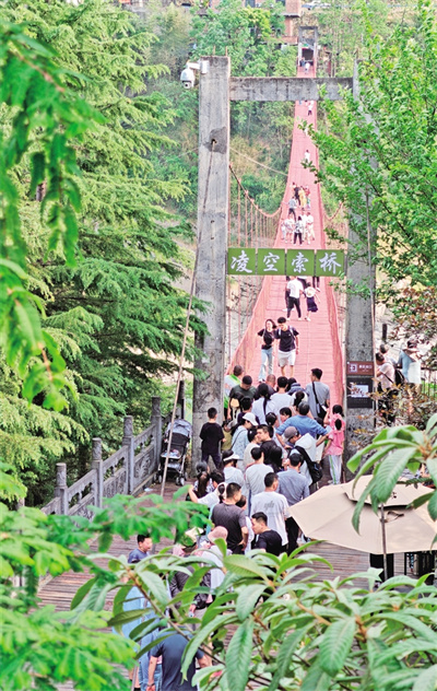 好山好水迎客來。5月3日,各地游客在紫陽縣陜甘茶馬古道景區(qū)打卡游玩。圖為游客在服務(wù)人員的引導下有序排隊,依次踏上景區(qū)內(nèi)的凌空索橋。儲茂銀 攝