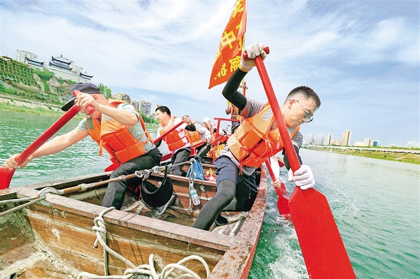 “中國(guó)紅 紅西鳳”杯第二十五屆安康漢江龍舟節(jié)主題活動(dòng),將于5月31日在龍舟文化園舉行。主題活動(dòng)結(jié)束后,30支龍舟代表隊(duì)將在漢江一橋至西津漢江大橋江面開(kāi)展龍舟競(jìng)賽活動(dòng)。競(jìng)賽活動(dòng)包括800米折返追逐賽、400米直道競(jìng)速賽和800米直道競(jìng)速賽,市民可在龍舟文化園和一江兩岸觀賽。圖為5月24日正在進(jìn)行水上訓(xùn)練的安康衛(wèi)健·中醫(yī)醫(yī)院龍舟隊(duì)。(記者 潘潤(rùn)生 攝)