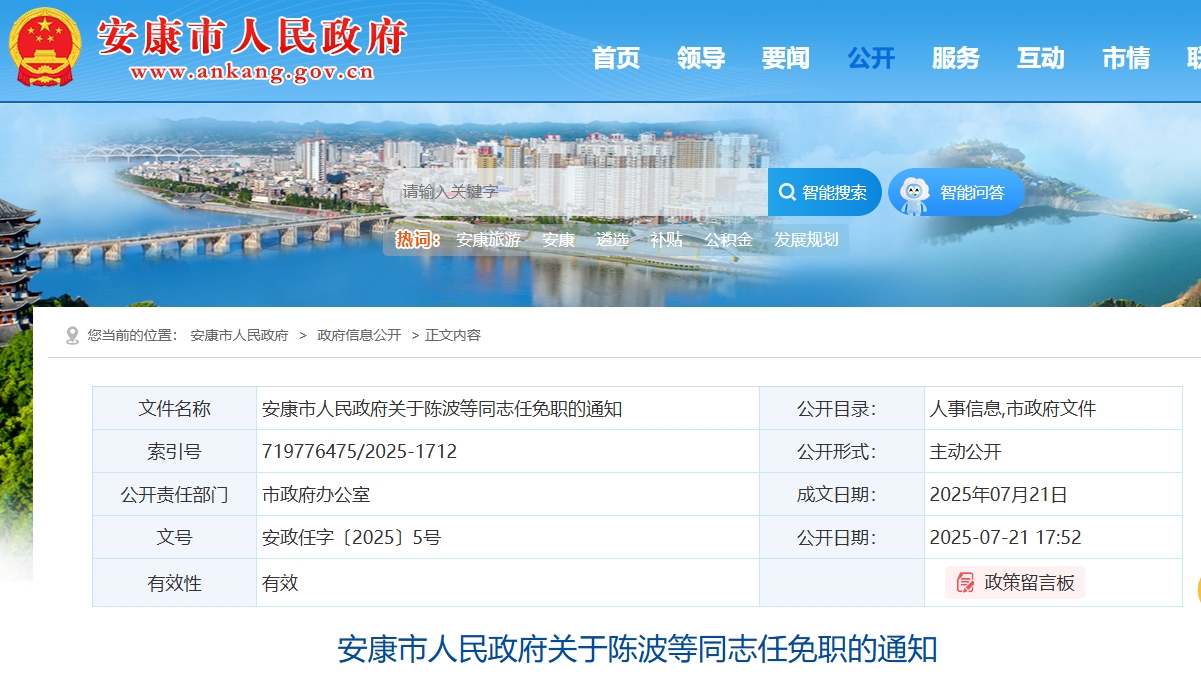 安康市人民政府關(guān)于陳波等同志任免職的通知