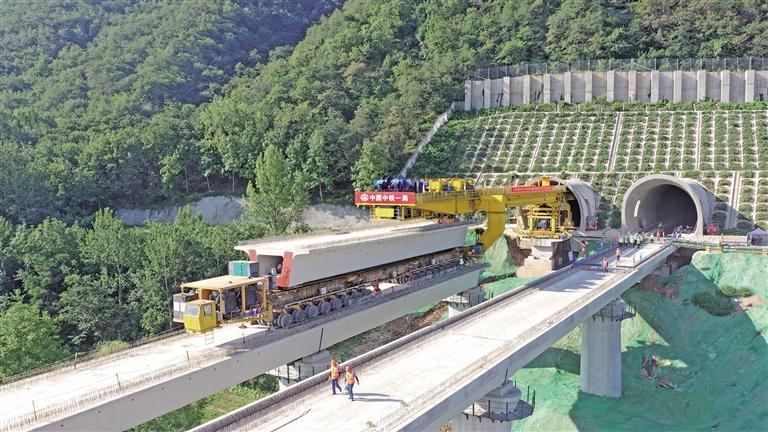西康高鐵跨關(guān)中環(huán)線立交特大橋最后一孔箱梁架設(shè)現(xiàn)場(7月28日攝)。7月28日,隨著架橋機將一孔長32.6米、重431.75噸的箱梁平穩(wěn)落在西康高鐵跨關(guān)中環(huán)線立交特大橋……
