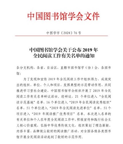 本網(wǎng)訊(通訊員 周啟立 王庭德)中國圖書館學(xué)會日前公布了2019年度“全民閱讀工作有關(guān)名單”評選結(jié)果,安康市圖書館榮獲“全民閱讀優(yōu)秀組織”稱號。