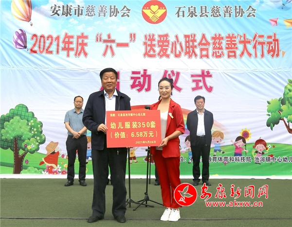 本網(wǎng)訊(通訊員 張蕾)5月26日,安康市慈善協(xié)會(huì)2021年慶“六一”向困難兒童送愛(ài)心慈善聯(lián)合大行動(dòng)在石泉縣池河鎮(zhèn)中心幼兒園正式啟動(dòng)。此次活動(dòng)主題為“童心筑夢(mèng)•愛(ài)暖明天”,旨在用大愛(ài)溫暖孩子們的心,讓他們感受到社會(huì)各界的關(guān)愛(ài),在愛(ài)的呵護(hù)下健康快樂(lè)成長(zhǎng)。