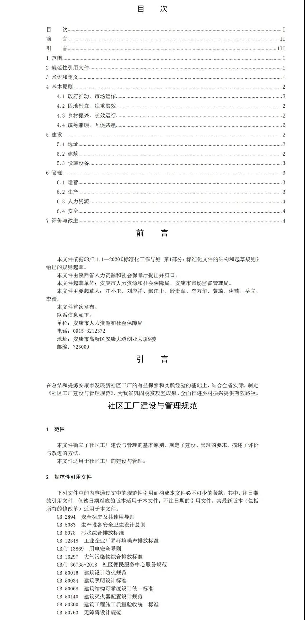 2020年6月,安康市人社局申請(qǐng)陜西省地方標(biāo)準(zhǔn)的立項(xiàng),同年7月,陜西省市場監(jiān)督管理局批準(zhǔn)同意該標(biāo)準(zhǔn)制定。安康市人社局聯(lián)合安康市市場監(jiān)督管理局共同成立標(biāo)準(zhǔn)起草組,形成標(biāo)準(zhǔn)草案。歷時(shí)兩年時(shí)間在全省范圍內(nèi)實(shí)地調(diào)研,通過書面征求意見,反復(fù)修訂完善,專家評(píng)議審查等程序,最終形成報(bào)批稿。該標(biāo)準(zhǔn)分別從范圍、規(guī)范性引用文件、術(shù)語與定義、基本原則、建設(shè)、管理、評(píng)價(jià)與改進(jìn)等七方面對(duì)社區(qū)工廠的建設(shè)與管理予以規(guī)范明確。