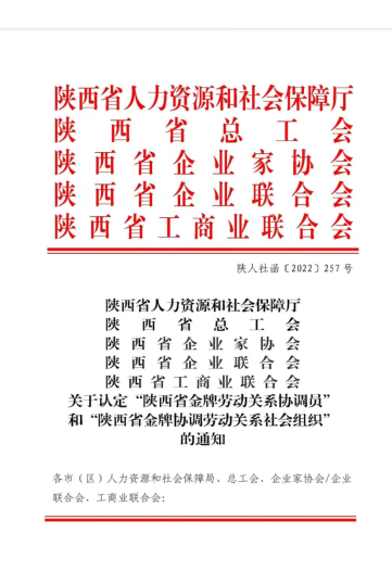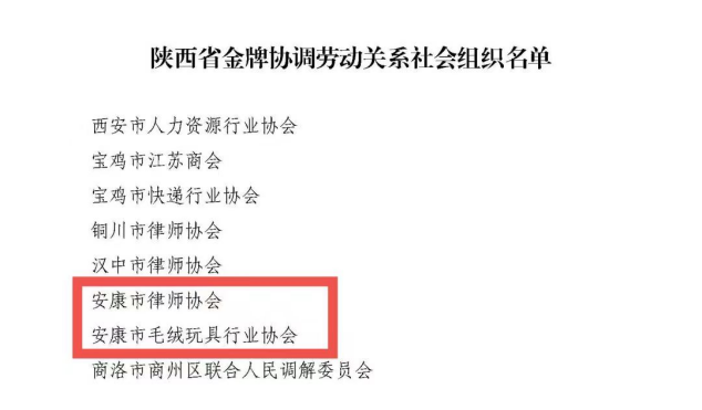 本網(wǎng)訊(通訊員 陳莉)2022年,省協(xié)調(diào)勞動關(guān)系三方委員會在全省范圍內(nèi)廣泛開展“陜西省金牌勞動關(guān)系協(xié)調(diào)員”“陜西省金牌協(xié)調(diào)勞動關(guān)系社會組織”評選活動。經(jīng)層層推薦、好中選優(yōu),我市白河縣金龍建材有限公司李東波、高新技術(shù)產(chǎn)業(yè)開發(fā)區(qū)創(chuàng)業(yè)就業(yè)服務(wù)局陳軍等12名同志被認定為“陜西省金牌勞動關(guān)系協(xié)調(diào)員”,安康市律師協(xié)會、安康市毛絨玩具行業(yè)協(xié)會被認定為“陜西省金牌協(xié)調(diào)勞動關(guān)系社會組織”。