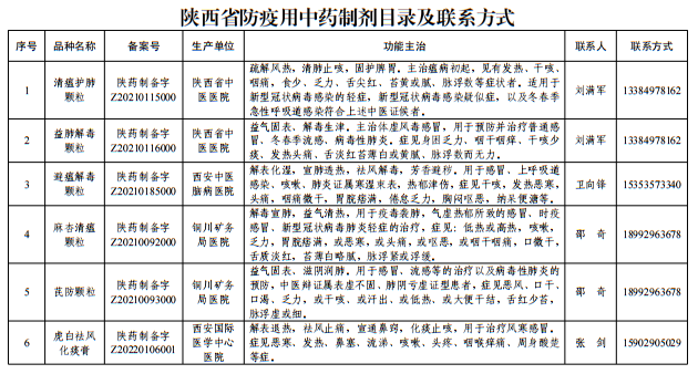 一是全市具有相關(guān)調(diào)劑品種使用需求且符合資質(zhì)的醫(yī)療機(jī)構(gòu)均可從《陜西省防疫用中藥制劑目錄及聯(lián)系方式》(詳見附件)中的醫(yī)療機(jī)構(gòu)購進(jìn)目錄中的13種制劑產(chǎn)品,調(diào)劑使用時(shí)間從發(fā)文之日起至 2023年6月30日。