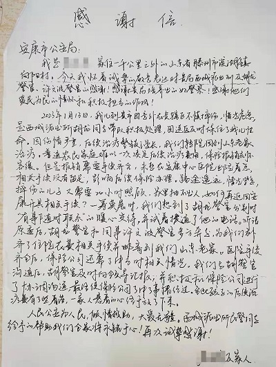 一封信,緊連著警民間的情誼;一頁信紙,書寫著群眾發(fā)自肺腑的感謝。“感謝貴局培養(yǎng)出的好警察,感謝他們愛民為民的情懷和積極擔(dān)當(dāng)?shù)淖黠L(fēng)……”近日,安康市公安局收到一封來自山東省滕州市濱湖鎮(zhèn)屈先生一家的手寫感謝信,字里行間滿是對(duì)安康市公安局漢濱分局西城派出所副所長(zhǎng)胡龍及其同事許文波心系群眾、履職盡責(zé)、為民解憂的感激之情和贊許之意。