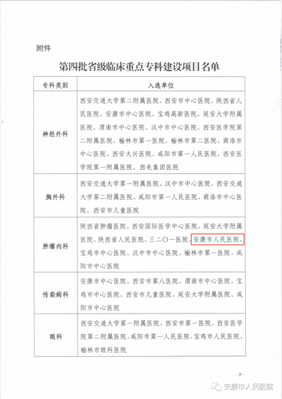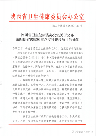 近日,陜西省衛(wèi)生健康委發(fā)文公布了第四批省級臨床重點?平ㄔO(shè)項目名單,安康市人民醫(yī)院腫瘤內(nèi)科名列其中,順利被評定為省級臨床重點專科建設(shè)項目。