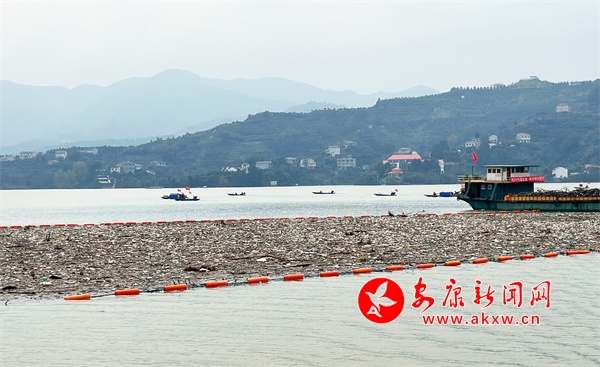 10月15日,筆者跟隨打撈隊(duì)來(lái)到瀛湖鳥(niǎo)島,大量的漂浮物被圍攔在河灣附近,與主河道形成鮮明對(duì)比。打撈隊(duì)負(fù)責(zé)人袁曉林介紹:“因秋淋天氣,9月中下旬起,安康經(jīng)歷十幾天的連陰雨,水位上漲,岸邊被淹沒(méi)的樹(shù)木、雜草就會(huì)在水面漂浮,影響水質(zhì)和景觀。我們?cè)诰皡^(qū)鳥(niǎo)島、清泉村、湖心街、南溪、流水等地分段集中打撈,提高效率,不影響旅游和通航。”