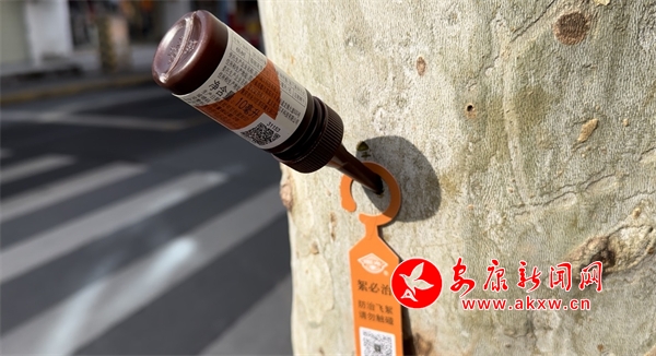 在城區(qū)育才路,市政園林工作人員先在法桐的樹干上斜鉆出一個數厘米深的小洞,然后把一支褐色瓶子插在樹洞中。安康市市政園林處綠化管護科副科長龔晨曦介紹,給法桐注射的藥物名叫“絮必治”,通過插瓶輸液法,在樹干打孔,把藥劑輸入樹體內,藥劑會隨著蒸騰作用擴散到樹體各部分,抑制花芽形成,從而不開花結果,達到控制懸鈴木飛絮的目的。今年計劃對城區(qū)500株法桐進行試點打藥,其原理就是通過藥物不讓果實成熟,也就不會有飛絮。同時也會采用修剪枝葉、夏季夜間高壓水槍噴水等方式,最大限度緩解法桐飛絮漫天飛舞擾民的現象,逐年逐步減少對市民的影響。