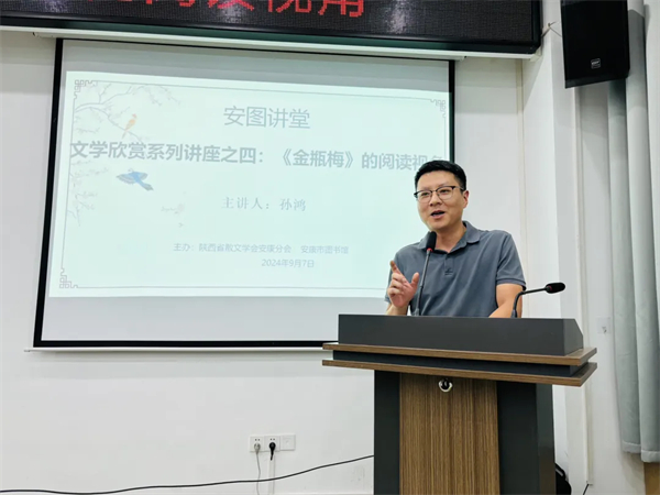 由陜西省散文學(xué)會(huì)安康分會(huì)攜手安康市圖書(shū)館主辦的“文學(xué)欣賞系列”講座,于9月7日舉辦第四場(chǎng)。平時(shí)定員50人的市圖書(shū)館多功能廳,當(dāng)日擠了83人。來(lái)自全市各地的作家、文學(xué)愛(ài)好者共同聆聽(tīng)了安康學(xué)院教授孫鴻主講的《〈金瓶梅〉的閱讀視角》。