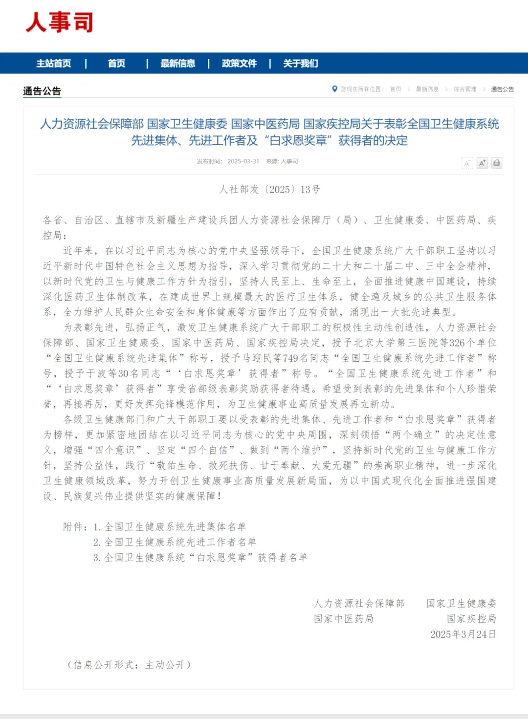 近日,人力資源社會保障部、 國家衛(wèi)生健康委等四部委發(fā)布關(guān)于表彰全國衛(wèi)生健康系統(tǒng)先進集體、先進工作者及“白求恩獎?wù)?rdquo;獲得者的決定,我市1個集體、1人分別獲得全國衛(wèi)生健康系統(tǒng)先進集體、全國衛(wèi)生健康系統(tǒng)先進工作者榮譽稱號。