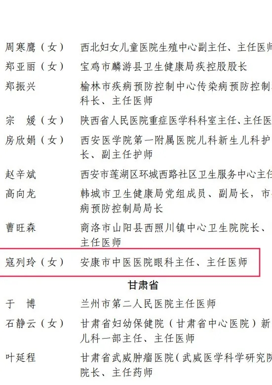 寇列玲,女,漢族,1975年10月生,陜西黃陵人,中共黨員,主任醫(yī)師,現(xiàn)任安康市中醫(yī)醫(yī)院眼科主任。該同志醫(yī)術(shù)精湛,服務(wù)患者耐心細(xì)致,心系社會,開展近視防控公益行進校園100余次,行程20萬公里,篩查學(xué)生10余萬人,受益學(xué)生50余萬人,解除安康山區(qū)數(shù)以萬計眼病患者痛苦,避免因盲致貧、因殘致貧。帶領(lǐng)眼科團隊銳意進取,眼科入選國家區(qū)域診療中心培育單位、國家中醫(yī)優(yōu)勢專科建設(shè)項目、陜西省區(qū)域診療中心。參與國家中醫(yī)藥管理局《前部缺血性視神經(jīng)病變》臨床指南制修訂,完成省中醫(yī)藥管理局十大病種《玻璃體積血》《消渴目病》創(chuàng)新項目,取得陜西省科技成果三等獎2項,被評為安康市第四屆十佳醫(yī)生稱號,榮獲安康市十佳科技青年獎,被評為安康市有突出貢獻(xiàn)專家,入選“西部之光”訪問學(xué)者。