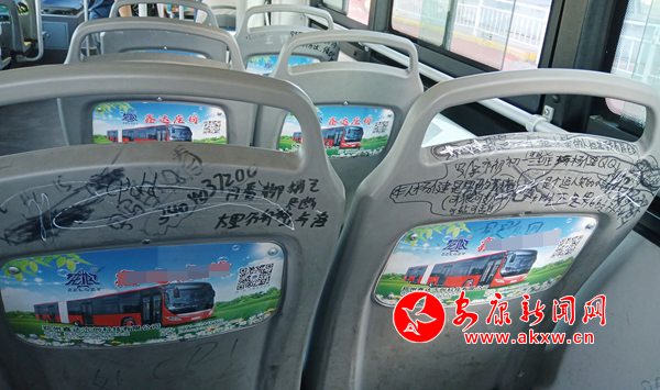 7月7日,筆者乘坐安康市城區(qū)7路公交車發(fā)現(xiàn),公交座椅靠背慘遭“涂鴉”,內(nèi)容不乏廣告標(biāo)語、低俗粗鄙、不堪入目的語言,嚴(yán)重影響乘車心情。希望廣大乘客文明乘車,還市民一個(gè)干凈整潔的乘車環(huán)境。(通訊員 成忠旭)siz安康新聞網(wǎng)