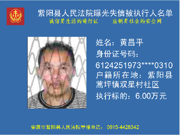 被執(zhí)行人黃昌平,你因不履行(2017)陜0924民初241號民事判決書確定的義務(wù),已被紫陽縣人民法院納入失信被執(zhí)行人名單庫依法進(jìn)行信用懲戒。信用懲戒范圍包括但不限于以下措施: