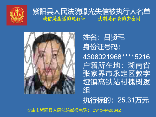 被執(zhí)行人呂賢毛,你因不履行(2017)陜0924民初241號民事判決書確定的義務,已被紫陽縣人民法院納入失信被執(zhí)行人名單庫依法進行信用懲戒。信用懲戒范圍包括但不限于以下措施: