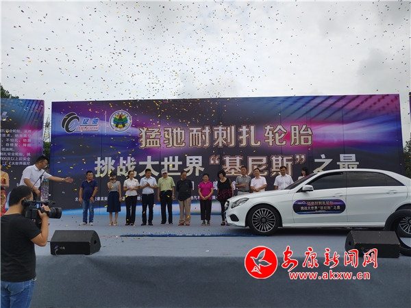 陜西猛馳汽車科技有限公司總經理徐曙光介紹,猛馳耐刺扎安全輪胎屬本公司研發(fā)的自主品牌,采用寬途3.0安全技術、納米高科技,目前是國內國際輪胎中技術最具先進且最具安全性能的品牌輪胎。“猛馳”耐刺扎安全輪胎具有不怕扎、防漏氣、防爆胎、自修復及降胎噪、高舒適和低油耗等多項高品質技術。本次挑戰(zhàn)活動他們將申報大世界基尼斯之最。