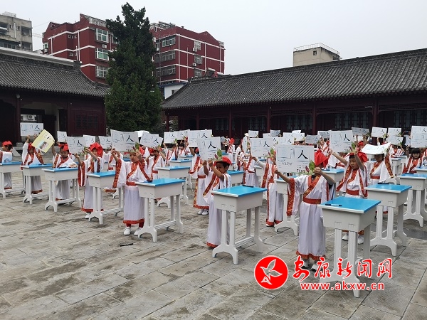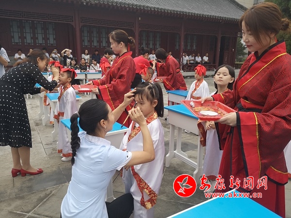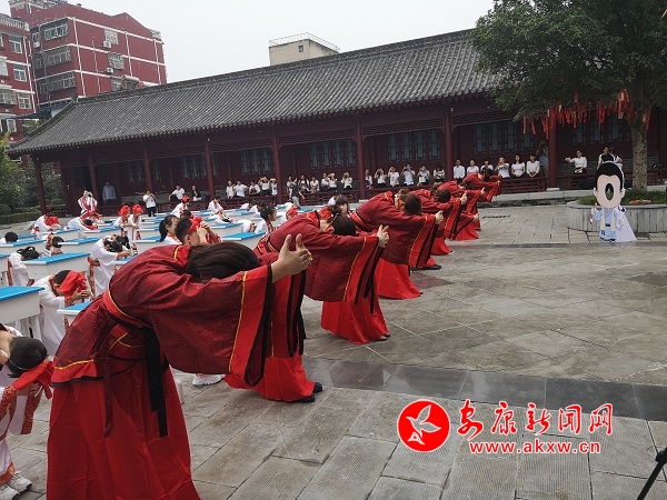 據(jù)了解,“開筆禮”是中國古代人生“四大禮”之首,是蒙童入學(xué)階段極為重要的儀式。“開筆禮”儀式主要分成六項內(nèi)容,每一項內(nèi)容承載著特定的教育目的。“正衣冠”要求學(xué)子們養(yǎng)成干凈整潔的生活習(xí)慣;“感恩鞠躬”讓學(xué)子向師長行揖禮,謝師恩、謝親恩,并為師者和長輩奉茶,讓他們從小懂得孝親尊師的道理;“凈手凈心”讓學(xué)子們從此靜心讀書,心無旁騖;“朱砂啟智”,表達(dá)了師長對學(xué)子們的美好祝愿,希望他們心明眼亮,聰慧過人;“擊鼓明志”讓學(xué)子們樹立遠(yuǎn)大的理想與目標(biāo);“開筆啟蒙”書寫“人”字,學(xué)會做人的道理。蒙童通過親身經(jīng)歷這種莊嚴(yán)古樸的儀式,實現(xiàn)從蒙童到學(xué)生的心理過渡。