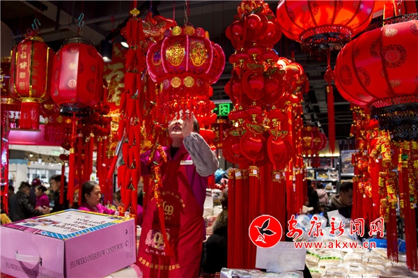喜盈門超市的工作人員王曉燕正在掛燈籠,紅艷艷的對(duì)聯(lián)、門花、燈籠、掛飾顯出一派熱鬧的新春氣象,王曉燕說最近生意好、銷量大,春節(jié)也正常營業(yè),一直到大年初六工作人員都輪流上班。
