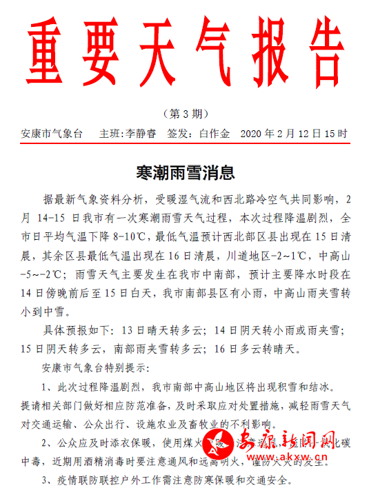 預(yù)計(jì)西北部區(qū)縣最低氣溫出現(xiàn)在15日清晨,其余區(qū)縣最低氣溫出現(xiàn)在16日清晨,川道地區(qū)-2~1℃,中高山-5~-2℃;雨雪天氣主要發(fā)生在我市中南部,預(yù)計(jì)主要降水時(shí)段在14日傍晚前后至15日白天,我市南部縣區(qū)有小雨,中高山雨夾雪轉(zhuǎn)小到中雪。