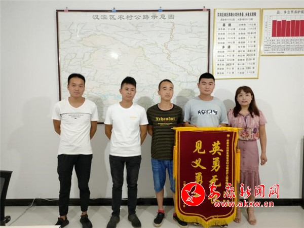 8月20日上午,周女士帶著家人一起來到漢濱區(qū)農(nóng)村公路管理局南區(qū)養(yǎng)護(hù)公司感謝四名公路英雄,并將寫有“見義勇為 英勇無畏”的錦旗送給了陳超、陳光飛、艾全軍、鄭小豪四人,感謝他們英勇無畏救其性命,救她順利脫險!