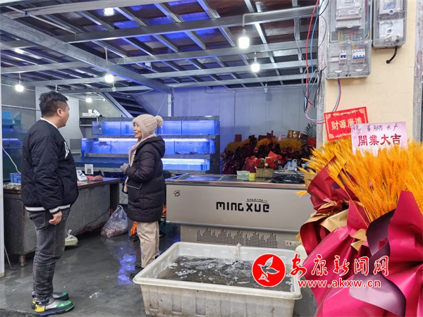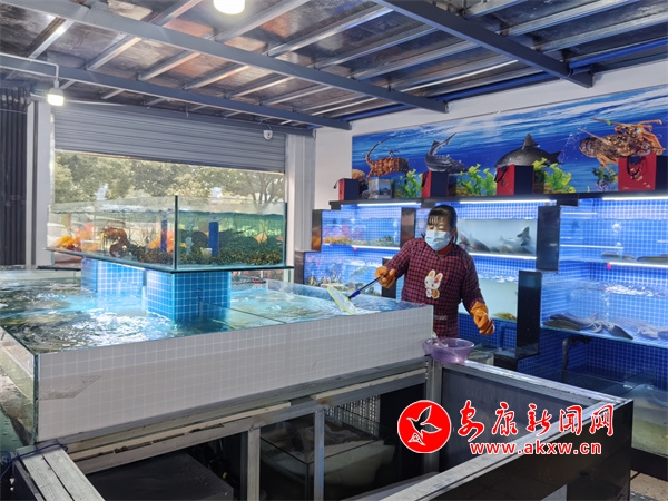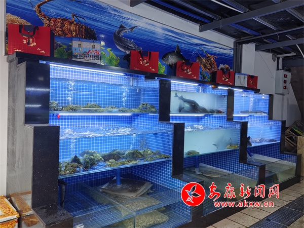 走進水產(chǎn)品區(qū)域,店鋪里的蟹、蝦、貝等海鮮貨品齊全,價格一一寫在魚缸上。購買蝦、蟹的顧客陳女士說,“我之前在興安菜市場的時候就喜歡在他家買,但原來那邊環(huán)境不太好,經(jīng)常人都下不去腳,現(xiàn)在店鋪周圍都很干凈。”