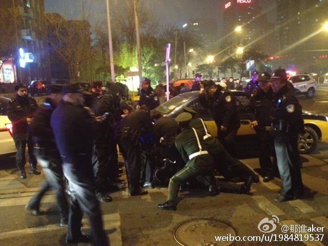 當(dāng)時(shí)附近行人很多,該男子先是由西往東走了一小段,“這時(shí)候店內(nèi)沖出來(lái)了兩名身穿西服的男性工作人員,拿著金屬制品開始追趕該男子,”該男子見狀從兜里掏出了一把長(zhǎng)約20公分的水果刀,一邊罵人,一邊越過馬路由東往西跑,兩名男店員在后面緊追不舍。圖為網(wǎng)傳抓捕現(xiàn)場(chǎng)。DGz安康新聞網(wǎng)