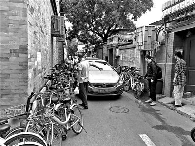 一名在胡同口維持秩序的醫(yī)院保安不時(shí)會(huì)提醒行人,不要將共享單車停放在醫(yī)院門口,并幫忙將道路中間的共享單車向兩邊靠攏,為路面留出更多空隙。但隨著人數(shù)增多,道路依然不可避免地越來(lái)越擠。北青報(bào)記者觀察發(fā)現(xiàn),近半個(gè)小時(shí)的時(shí)間里,就有四輛機(jī)動(dòng)車被胡亂停放的單車卡在道路中間,被困車輛甚至連車門都難以打開,只能求助醫(yī)院保安或者周圍居民來(lái)挪開車旁的共享單車。8點(diǎn)左右,一名ofo小黃車運(yùn)營(yíng)人員在接到醫(yī)院保安的電話后趕到現(xiàn)場(chǎng)。據(jù)他介紹,僅現(xiàn)場(chǎng)的小黃車就需要七八次才能全部搬走,搬出來(lái)的單車會(huì)被投放在附近其他需要用車的地點(diǎn),“搬運(yùn)工作大概會(huì)用一上午吧。”